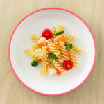 Omie Easy Scoop® Plate features a patent-pending design, invented after years of watching how toddlers actually eat. We noticed the struggle: foods sliding off the plate, toddlers using fingers to scoop, meals ending in mess and frustration. So we created a plate with a gently curved edge that guides food back onto the spoon, not the table. It’s a parent-designed solution that truly works and once you try it, you’ll see why.